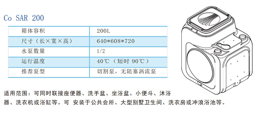 一体化污水提升装置是高效、 经济的地下 污水解决方案, 专门用于收集和提升不能 依靠重力自流至市政排污管道的污水, 根 据需要可配套涡流泵和切割泵。Co SAR 系列箱体为PE材质,按型号可分8 0 、 120、200、500四类,其中80、120、 200可配1台泵,200、500可配2台泵。